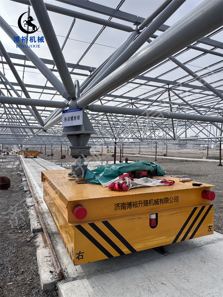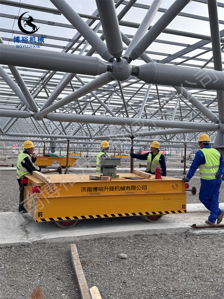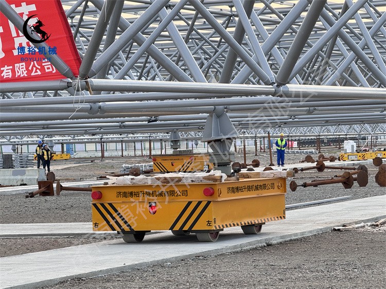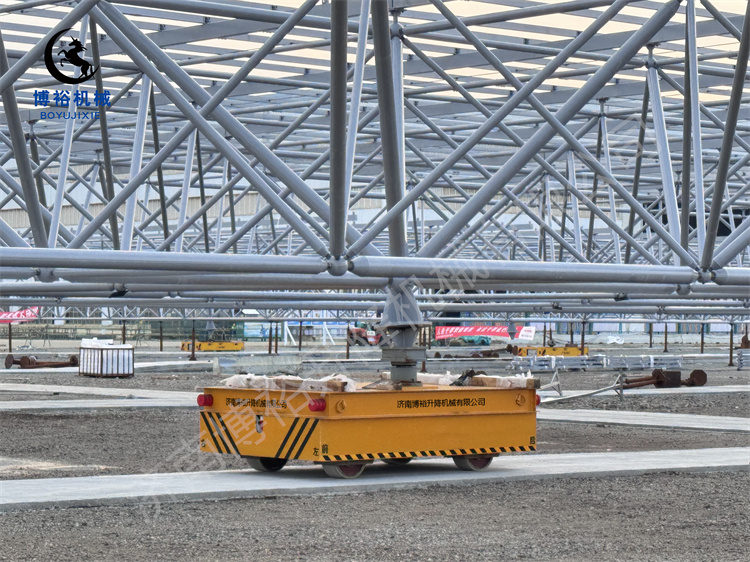 在实拍的转运作业现场,4台160吨重型AGV全向车成为绝对“主角”,展现出超凡的重载机动性能。该款重型AGV突破传统运输设备的移动局限,具备横移、纵移、原地360°转圈等全向灵活运动能力,可在码头有限空间内自由调整位置,完美适配光伏网架的多角度转运需求;同时,设备搭载精准升降系统,最大升降幅度可达400毫米,能够根据作业需求平稳调节承载高度,有效保障光伏网架在转运过程中的平稳性,避免构件受损。